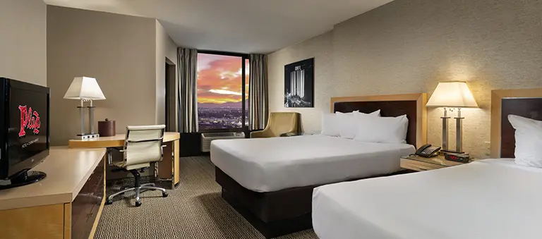 Our Deluxe Two Queens Room has Two Beds (approximately 325 square feet) and offers our standard amenities of a 32-inch flat-screen TV with premium cable channels, iron/board, clock radio, bath amenities and in-room safe.